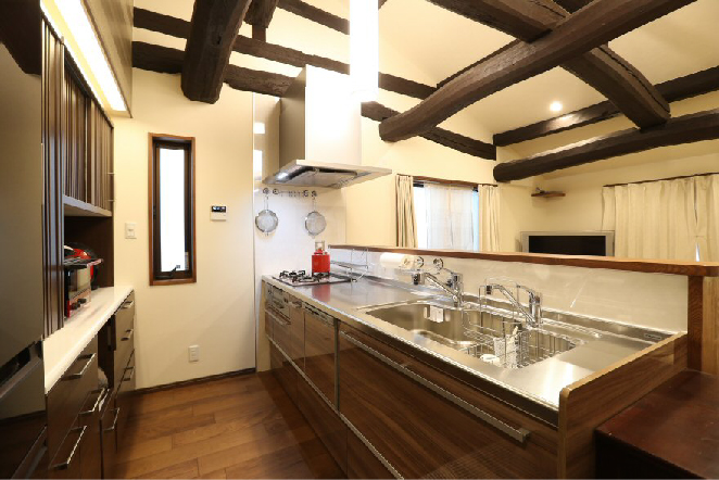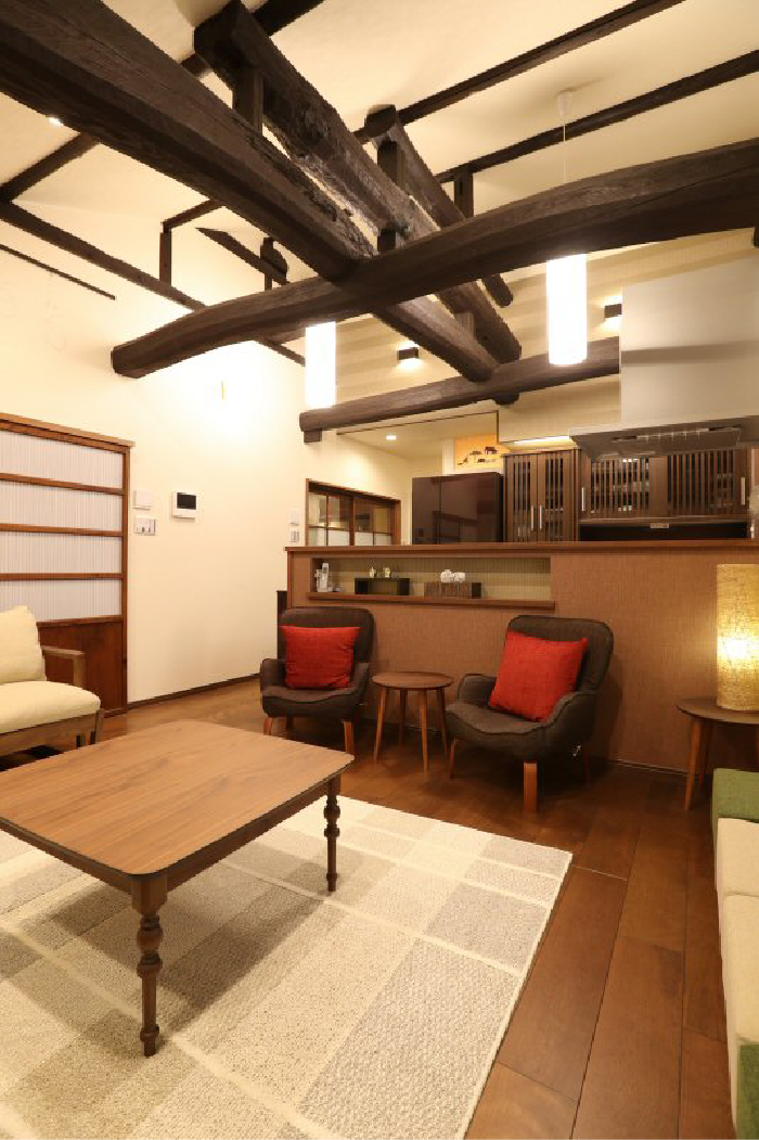 古民家の良さを活かした吹き抜け天井で別荘のような空間を演出!