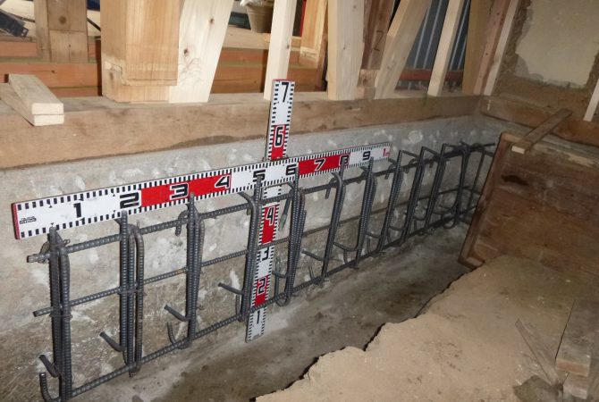 既設の無筋の基礎に、鉄筋入り基礎を抱かせて基礎補強。