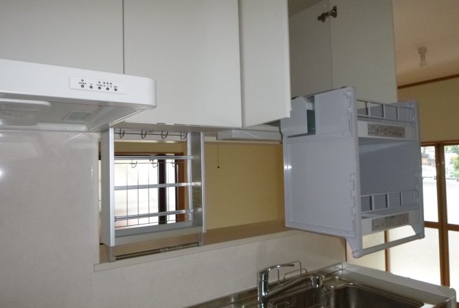 ムーブダウン・プルダウン吊戸棚で、小柄な奥様も楽に収納可能に。