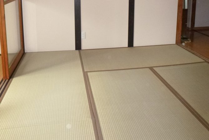 和室の柱を墨色に塗装、古民家風に。 畳は和紙畳(従来の天然い草畳表の自然な質感と日焼けしない・ささくれない等の高機能を併せ持った畳表)を使用。