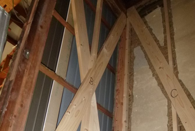 筋交を入れて、壁補強。 金物も忘れずに取付完了。